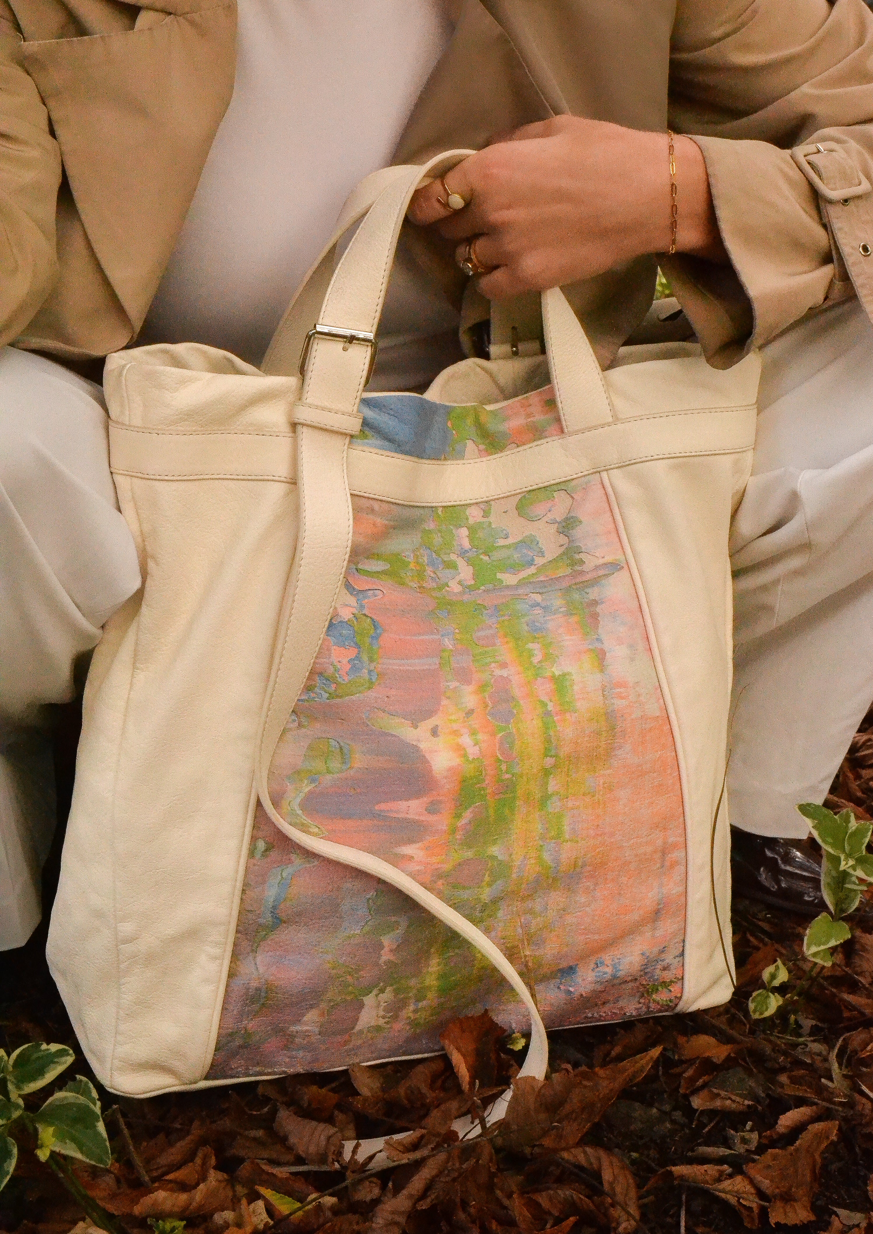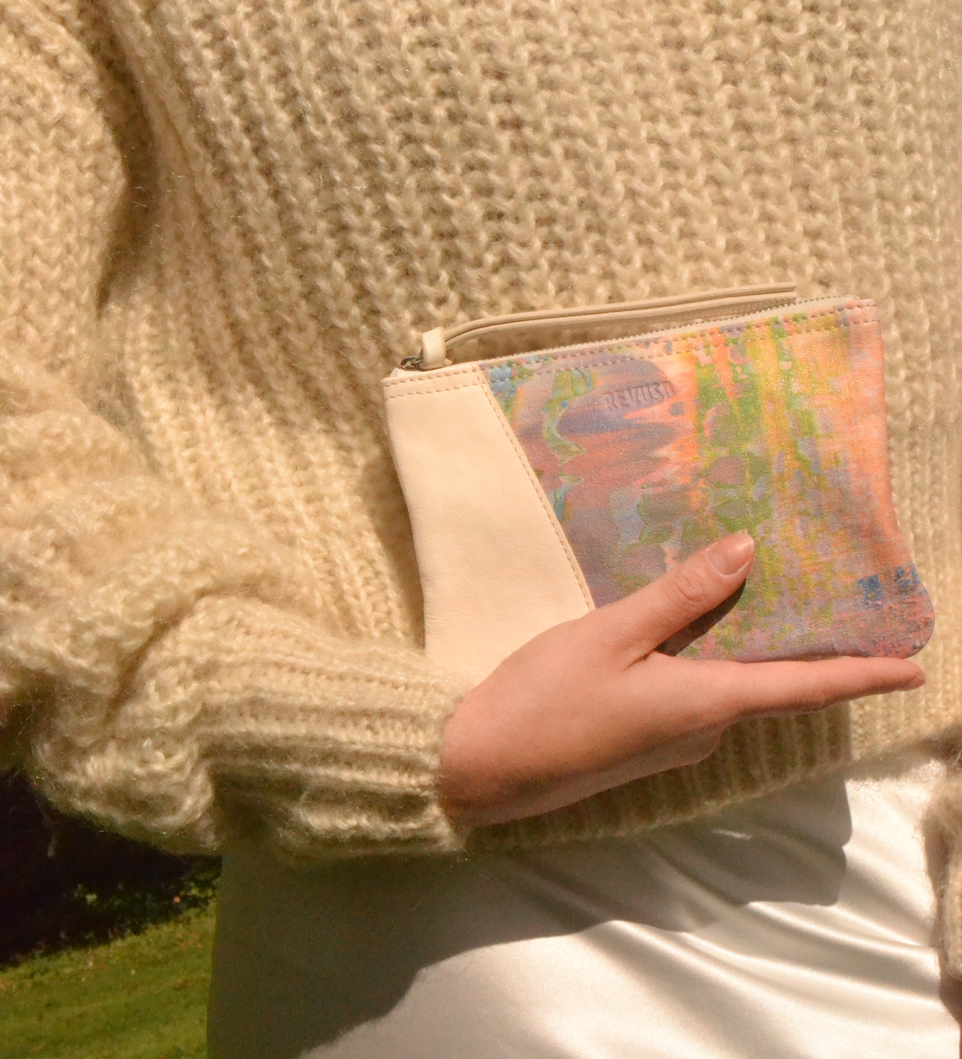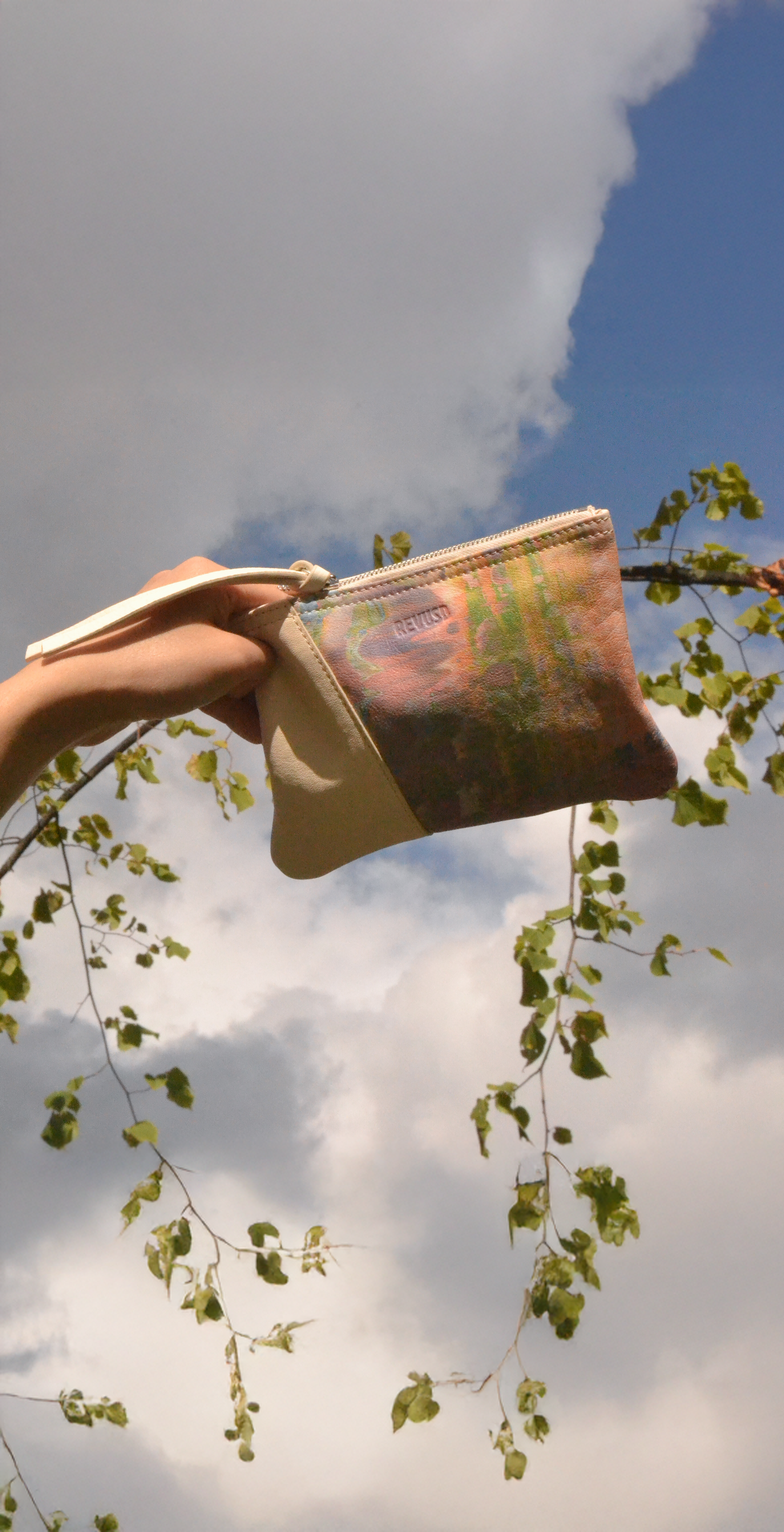 Her work Lavender Fields was created exclusively for her collaboration with REVUSD. Inspired by the French lavender fields, she translated soft lilacs, broken whites and neutrals into a painting that now forms the basis of the Lavender Fields collection. Reimagined in leather, each bag shows a fragment of the artwork.
