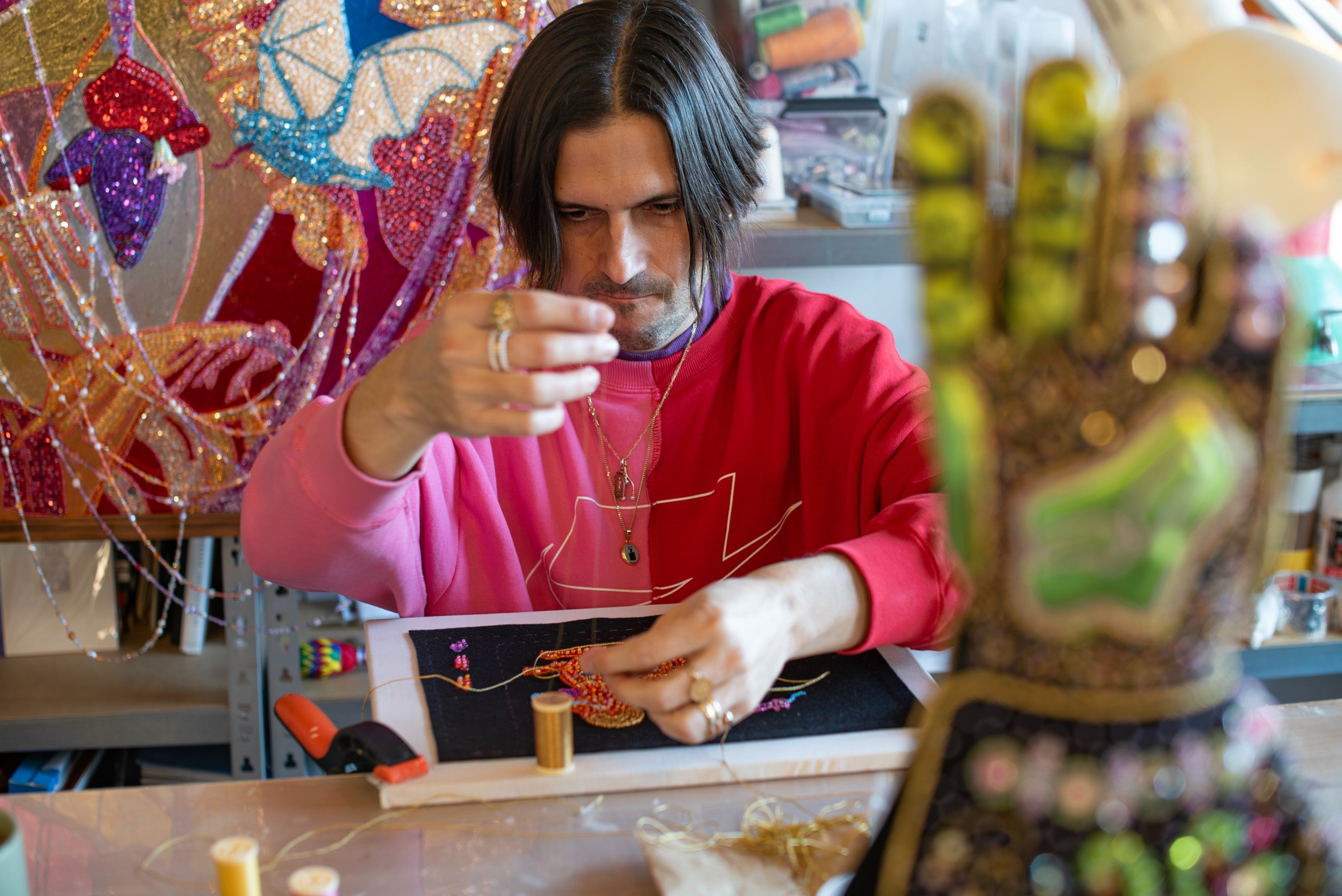 For REVUSD, Jorge Mañes Rubio created New Prophets: three hand-embroidered works inspired by an 8th-century Spanish manuscript where Romanesque, Islamic and Byzantine influences meet.
