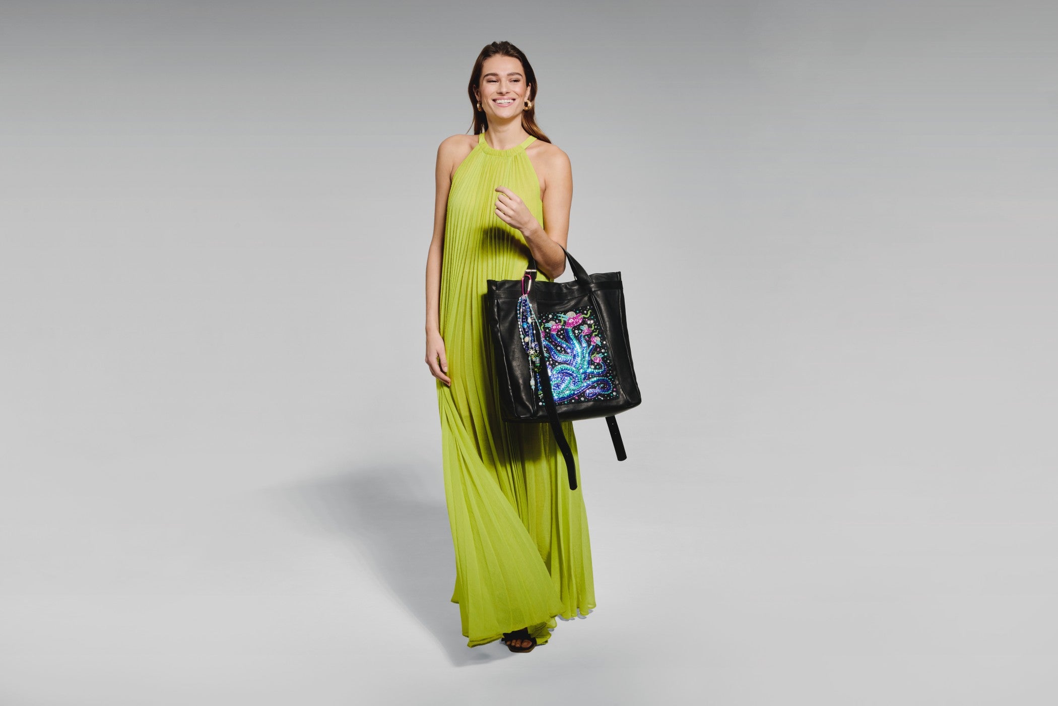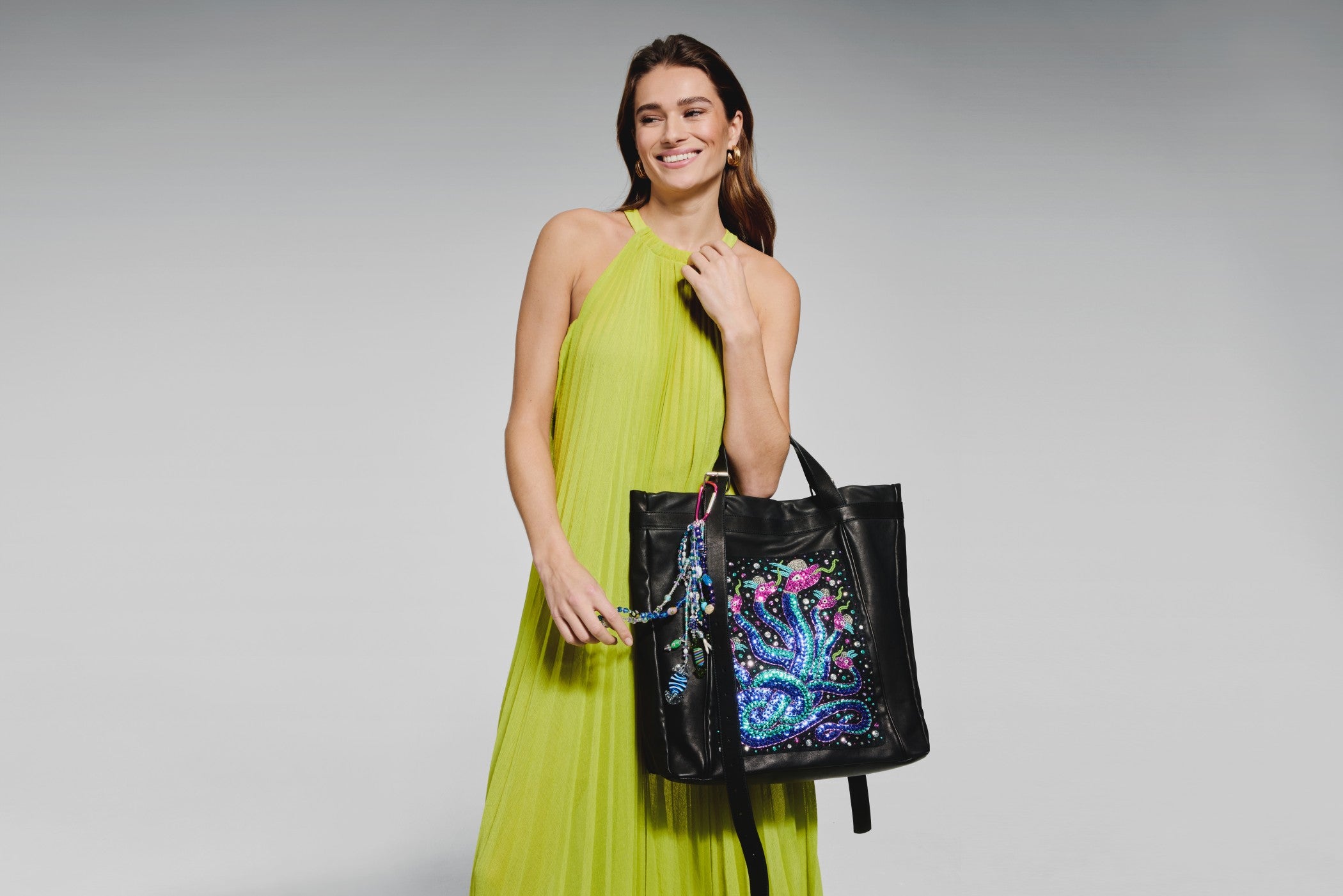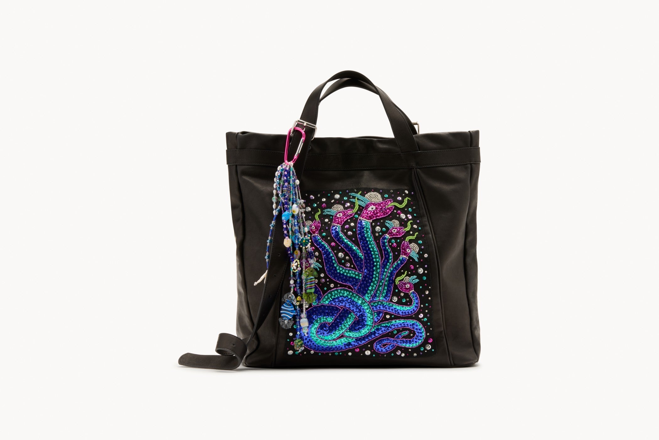 Each piece is built through slow, meticulous beadwork - including glass beads and bag charms the artist hand-blown in Venice. Layer by layer, the compositions honour non-human species and elevate leather into symbolic, talismanic forms.