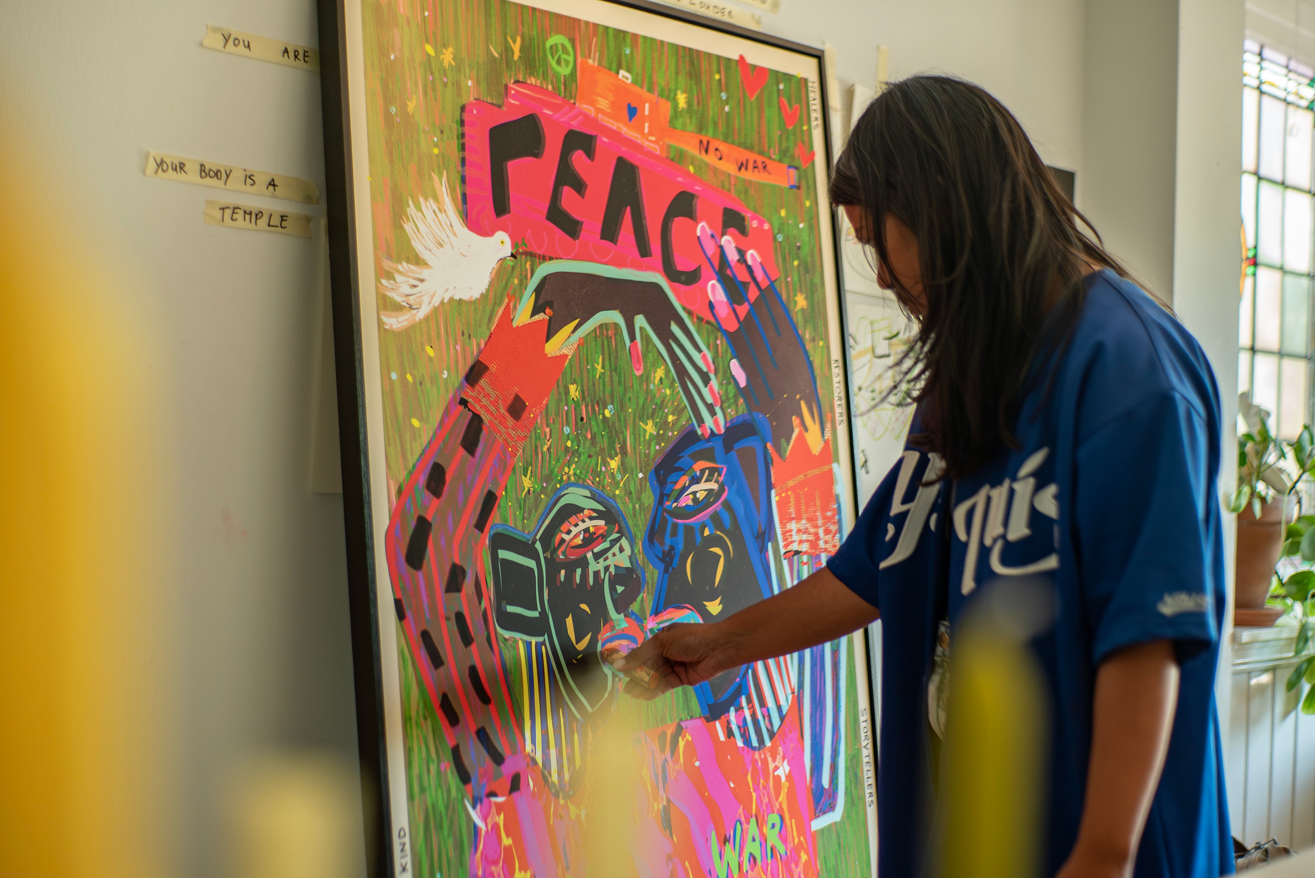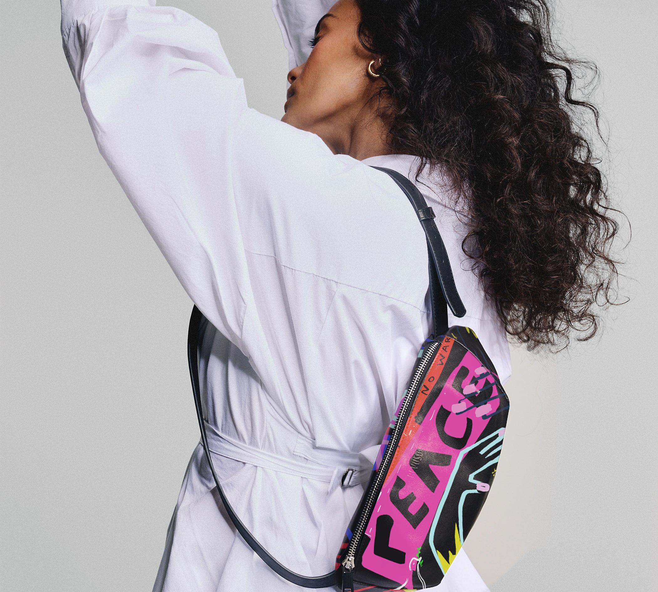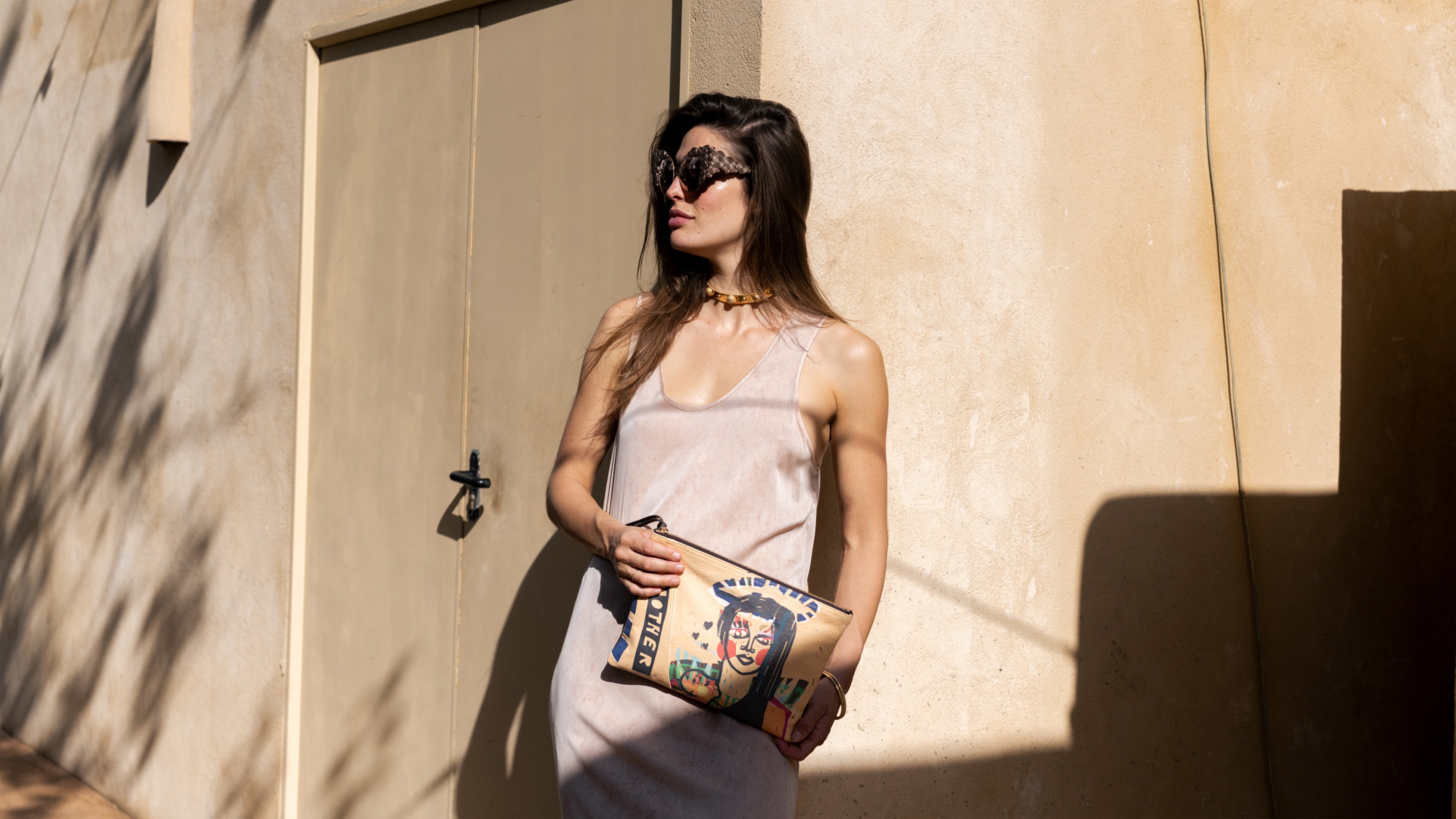 Through advanced embedding techniques, a fragment of this painted plea is carried onto the leather. Preserving its emotion, energy, and intent. A sculptural object of hope, to carry into the world.